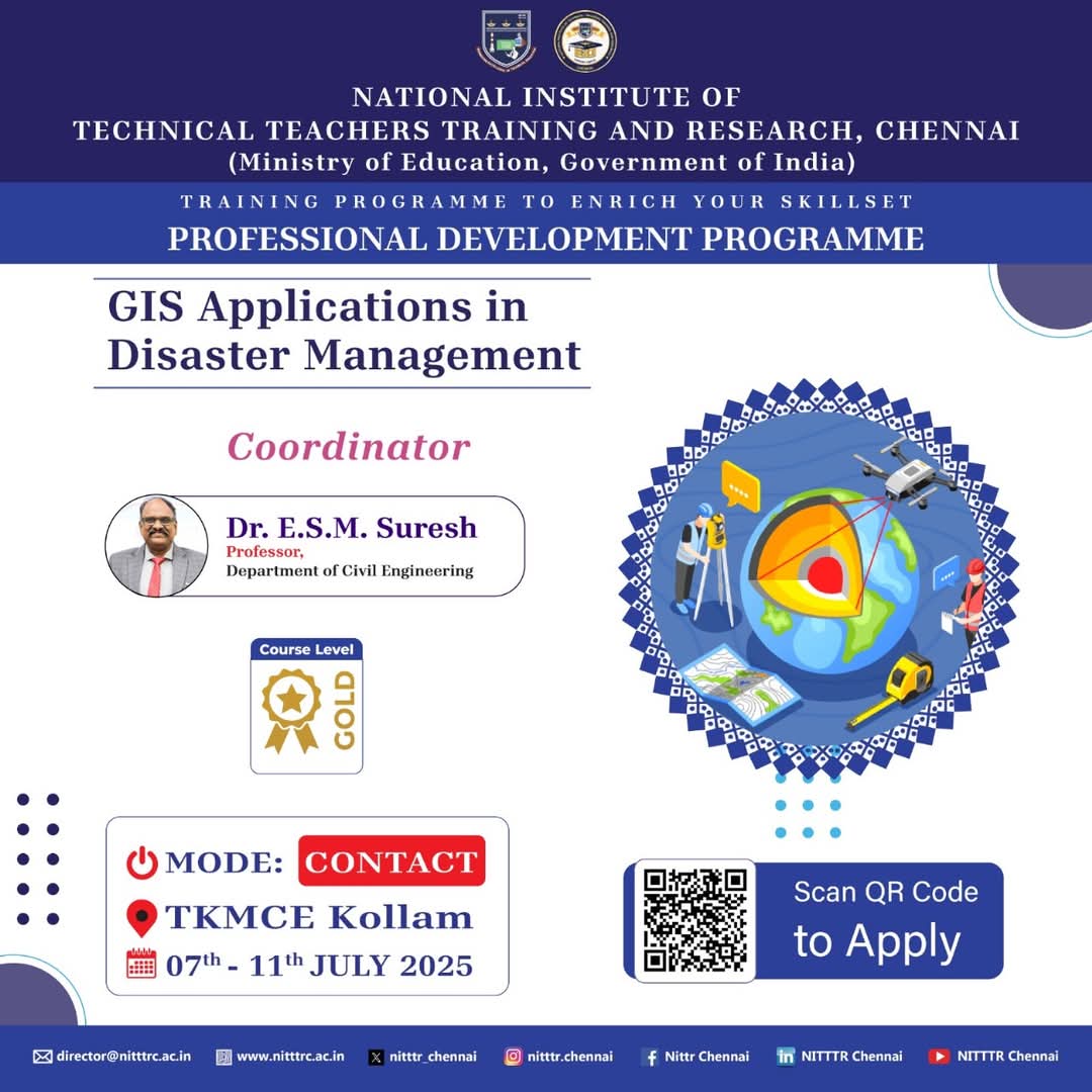 NITTTR Chennai is going to conduct a Professional Development Programme on “GIS Applications in Disaster Management” at TKM College of Engineering, Kollam, Kerala, in contact mode from 07.07.2025 to 11.07.2025.